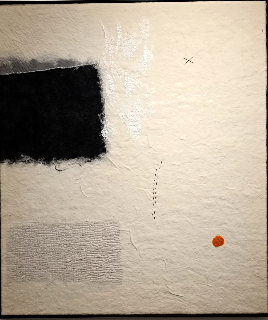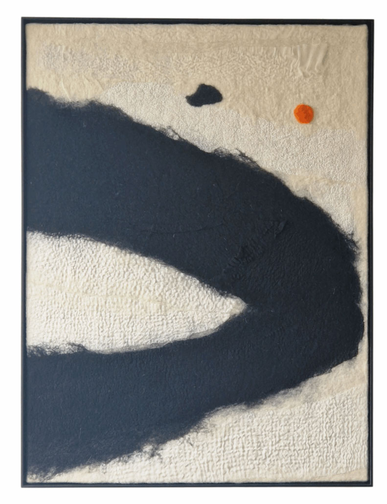 L’énergie d’Émilie de DEWAELE me touche : insoumise à la dichotomie du monde, sa violence, son injustice, Émilie, DEWAELE, puisse dans sa danse avec la matière brute, dans la sensualité de la laine, et dans la couleur, le noir et blanc, une énergie plus profonde qui appelle à la liberté du geste, à l’équilibre et à la paix intérieure, à la méditation et à la spiritualité. Quand le « soleil orange » apparaît, l’œuvre est achevée et la paix retrouvée… Merci Émilie. Estelle LEBAS.