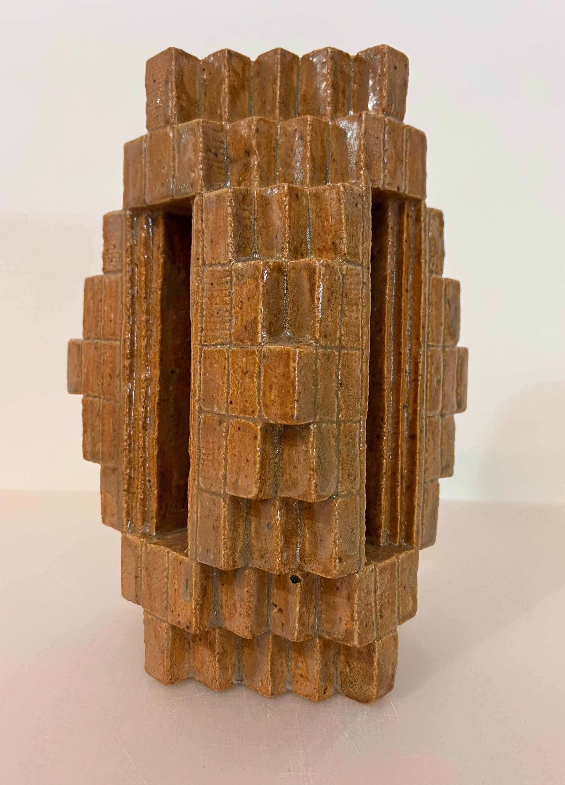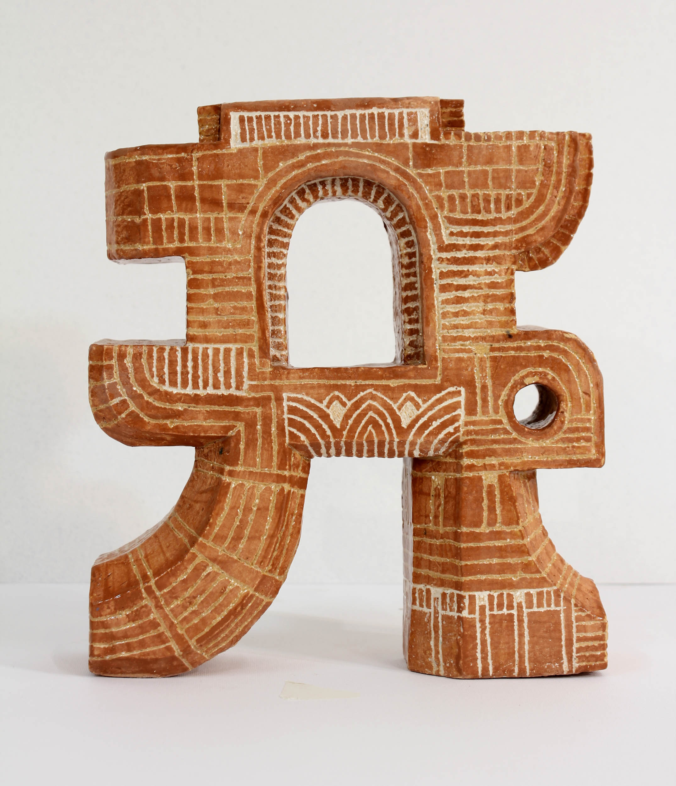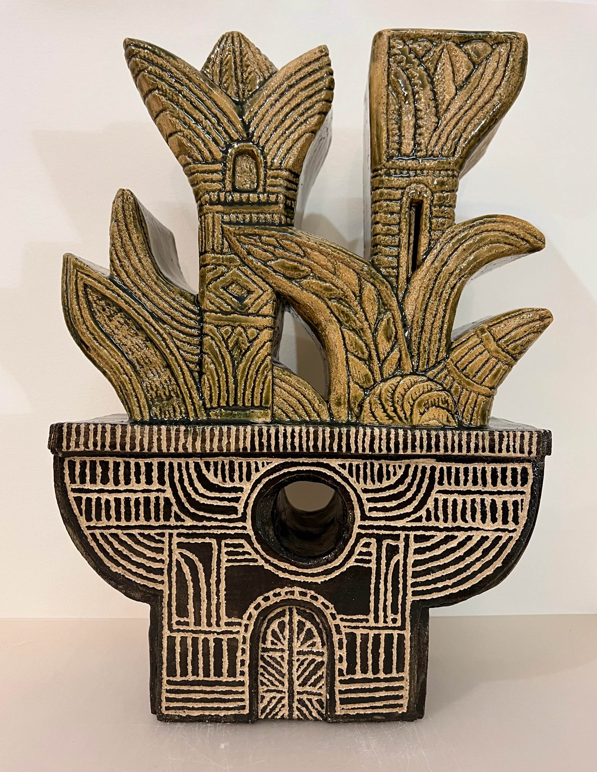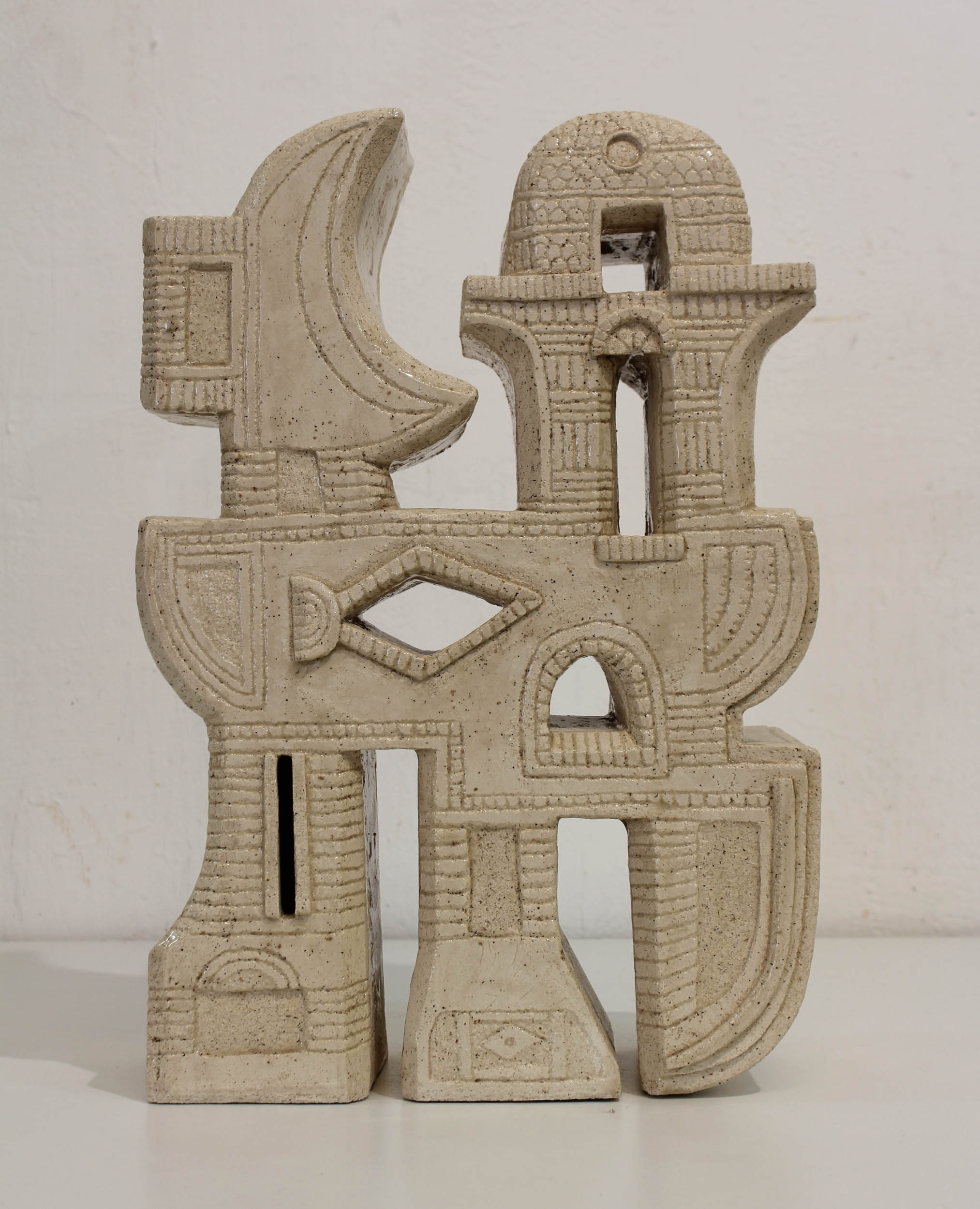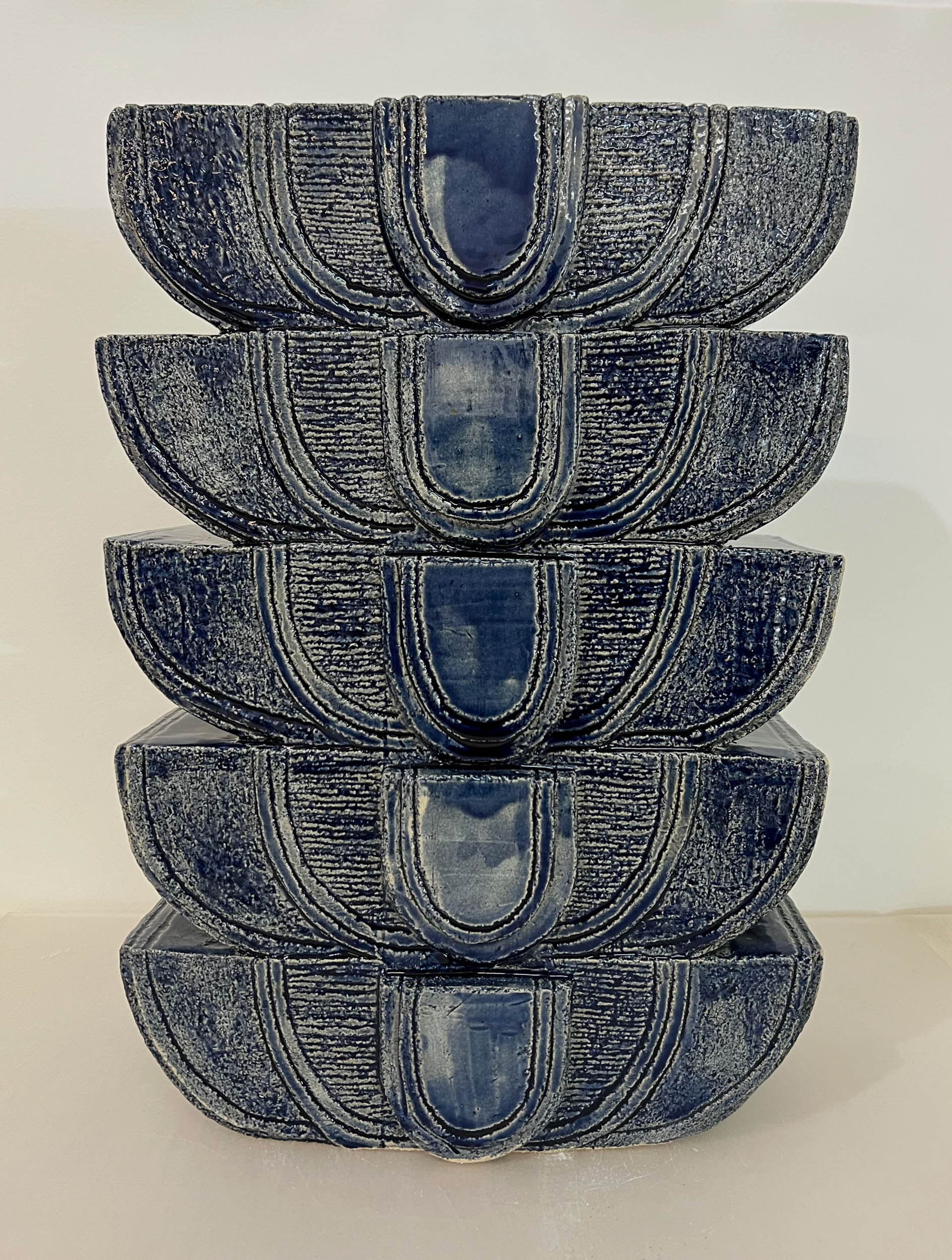 La céramique depuis 2021, lui donne la possibilité de réaliser des azulejos singuliers et des volumes totémiques.