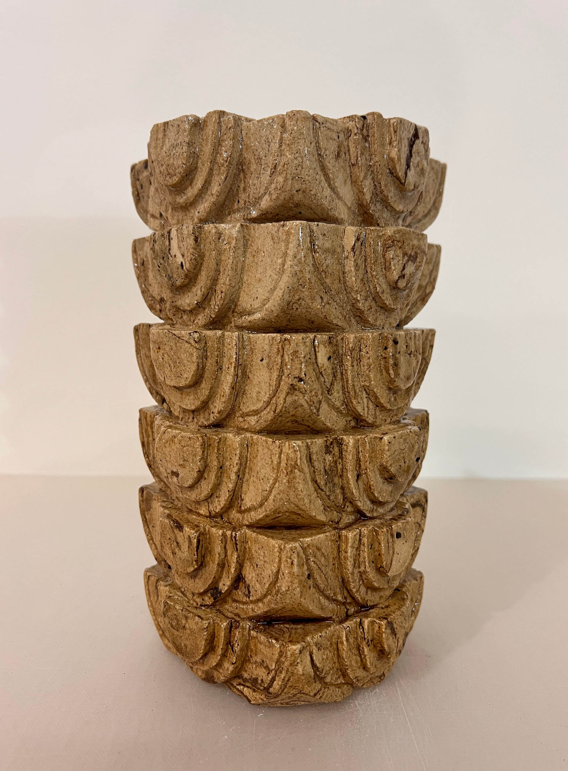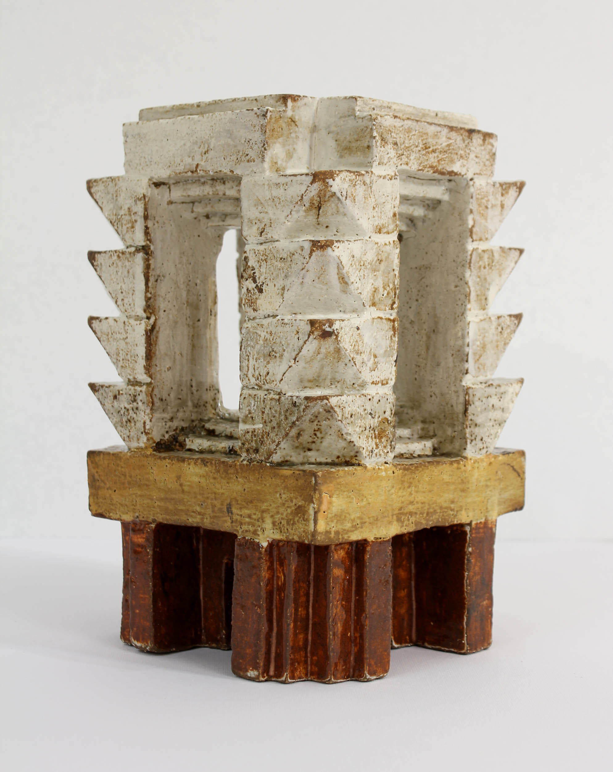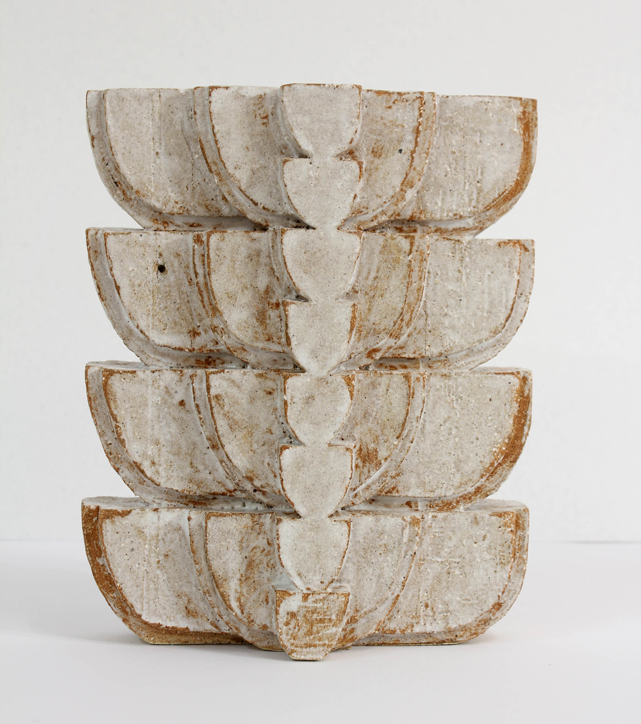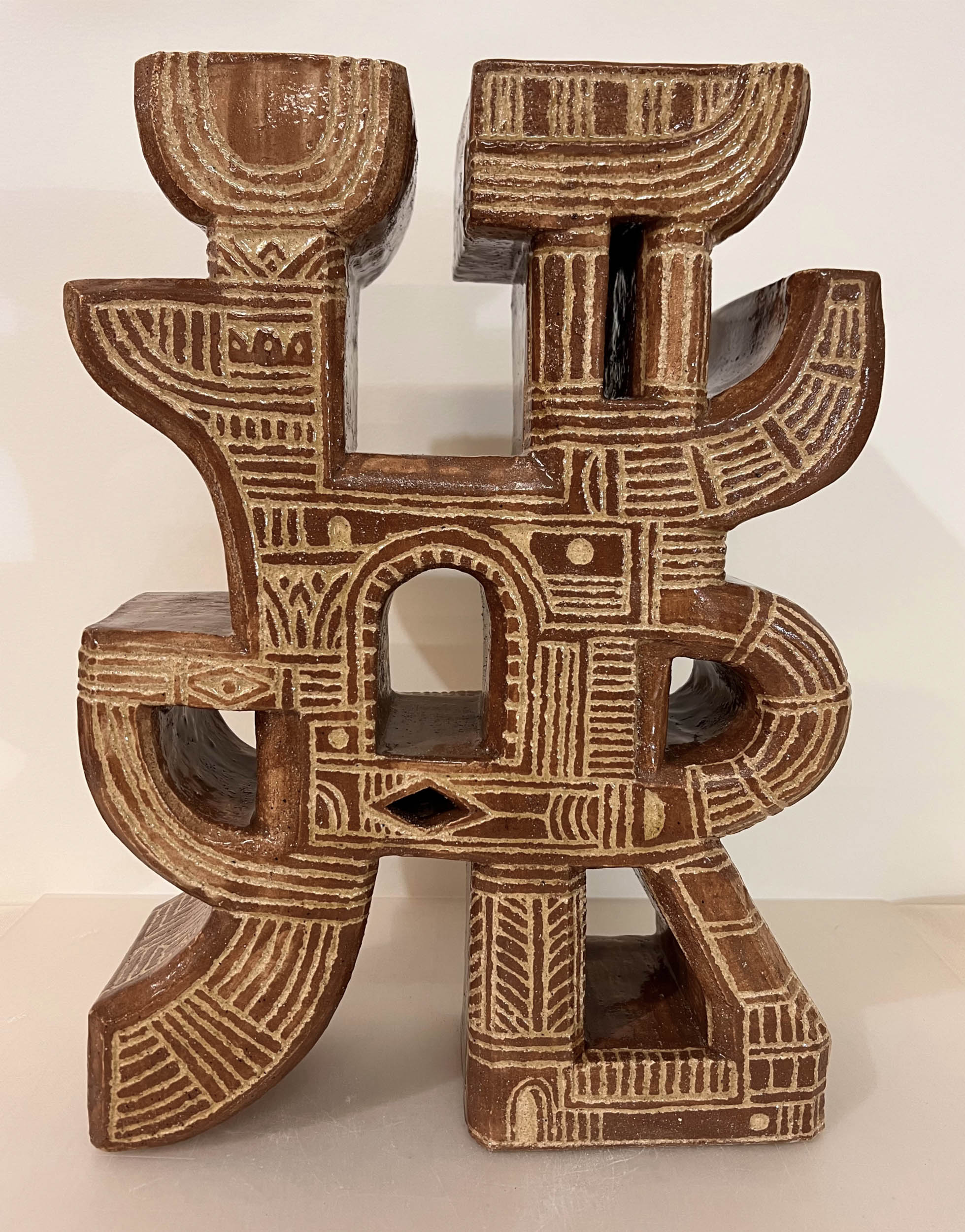 La céramique depuis 2021, lui donne la possibilité de réaliser des azulejos singuliers et des volumes totémiques.