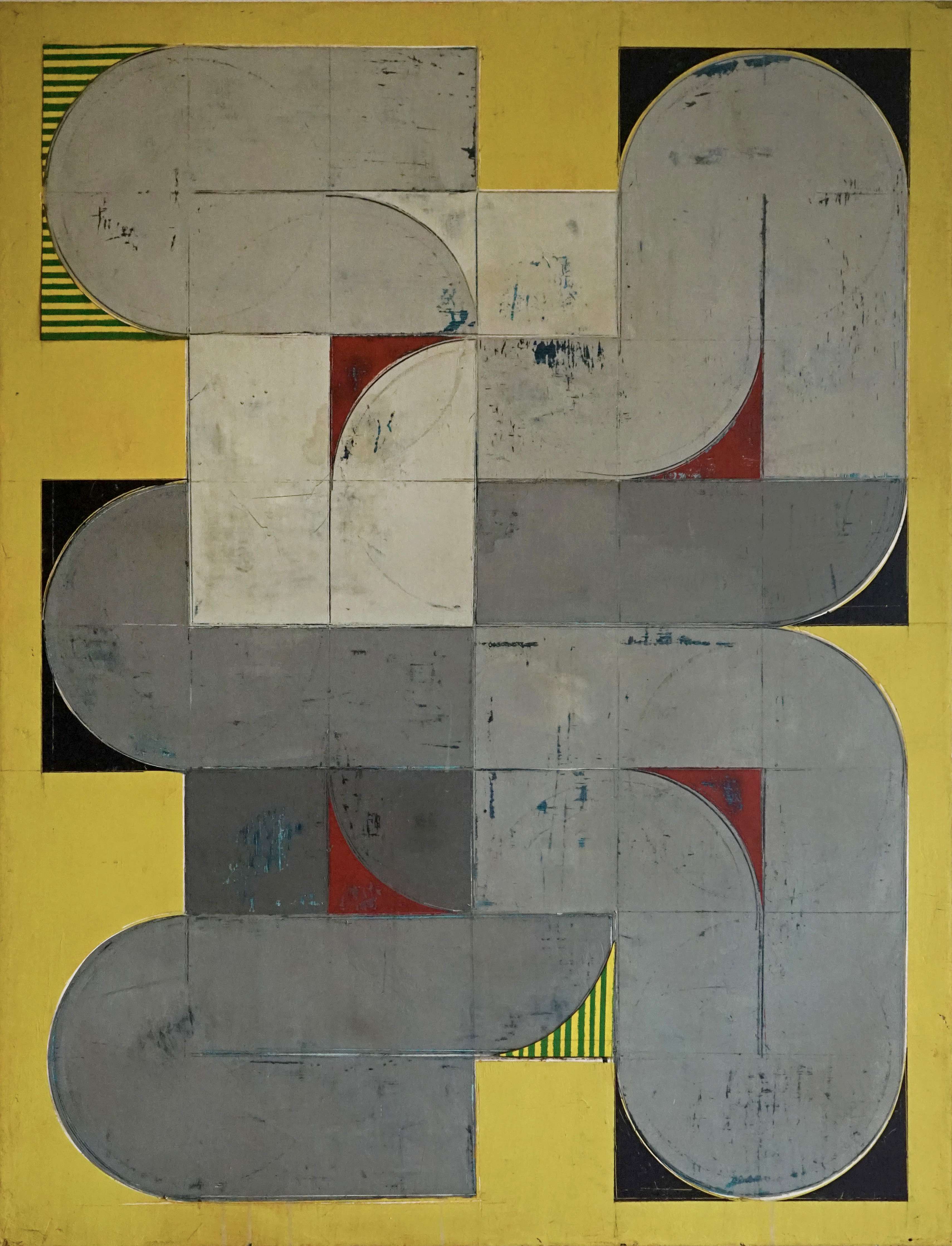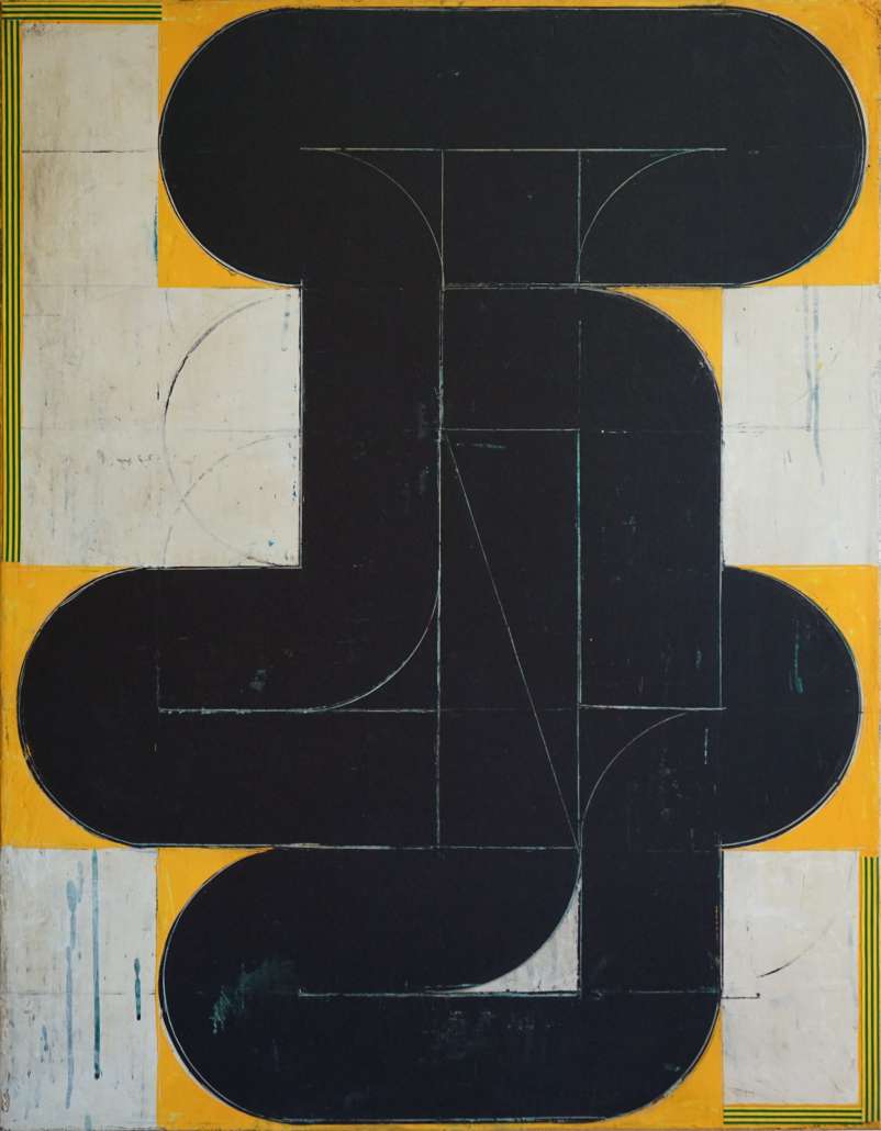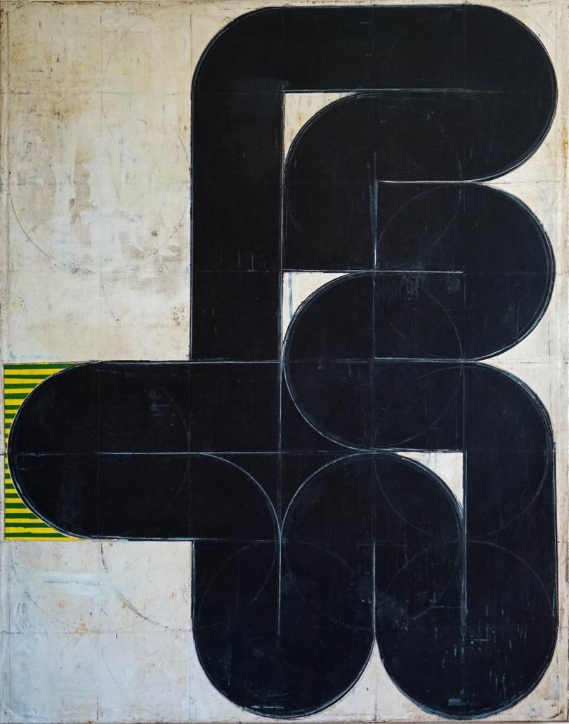 Le placement de cercles dans le format défini et leurs connexions pour former des formes nouvelles et récurrentes rappellent un processus de décodage d’un système inconnu et magique, d’ouverture et de fermeture de nouveaux espaces dans la peinture.